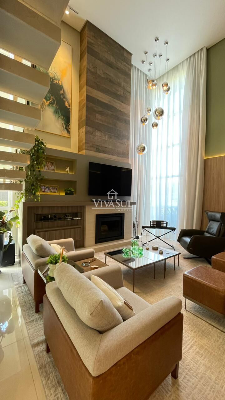Logo na entrada, a sala de estar impressiona com pé-direito duplo, excelente iluminação natural e lareira, integrada à sala de jantar e cozinha, criando um ambiente amplo e acolhedor para o dia a dia.